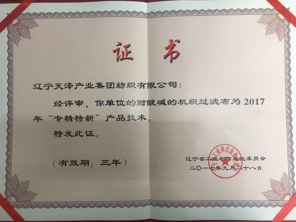 耐酸堿的機(jī)制過濾布”和“混紡導(dǎo)電紗及其防靜電過濾布”獲遼寧省2017年中小企業(yè)“專精新特”產(chǎn)品技術(shù)